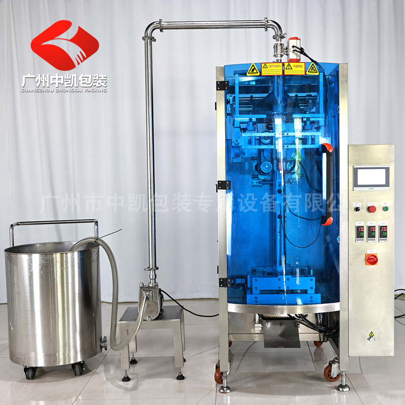 廣州中凱包裝的果汁果膠果醬果漿雙物料雙液體全自動包裝機特點和功能,可根據(jù)用戶需要定制下料方式。...